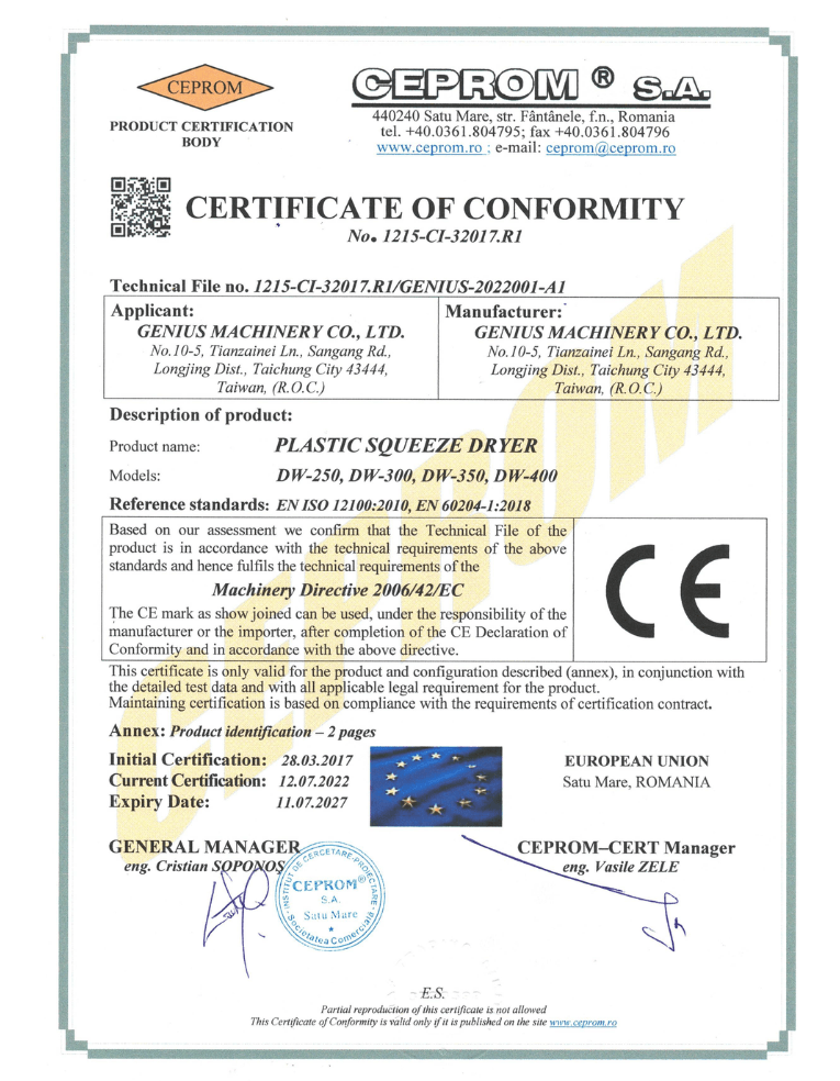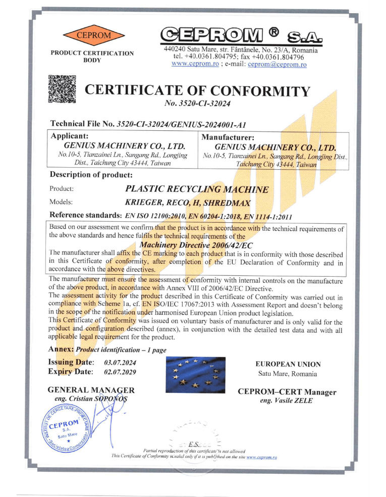 지니어스 머시너리(Genius Machinery Co., Ltd.)는 플라스틱 재활용 장비의 종합적인 공장 계획 부문을 전문으로 하고 있으며, 40년 이상의 플라스틱 재활용 장비 설계 및 제조 경험을 보유하고 있습니다.